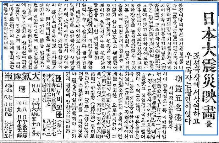 일본대진재 영화를 조선극장에서 상영하고 우리 독자는 할인이 있다. 동경 지방의 공전의 진재로 “불나라” “죽음의 무덤”이 된 수라장을 편답하며 두 명의 기사를 희생에 바치어서 박히인 동경진해영화는 조선극장 주인 황원균 씨의 활동으로 제일보가 조선극장에 도착하였다. 신문지상으로만 보와도 그 처참한 광경을 능히 생각할 수 있었거든 그 현장을 박히온 활동사진을 볼 때에 과연 우리의 감회는 어떠할까?