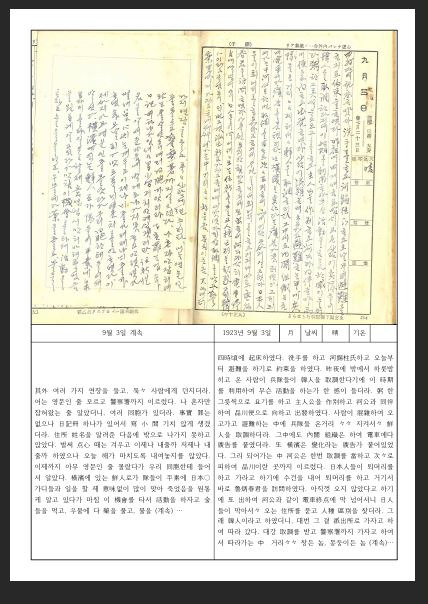 9월 1일(토) “김용선 씨가 업혀서 왔더라. 그래서 몸을 어루만져주고 겨우 정신을 차린 후 조금 있더니 지진이 일어나더라. 그래서 집이 무너질 것 같아 뛰어나오니 집이 무너져버렸다. 한 몇 분쯤 하여 또 한 번 지진이 있었다. 시내로 가자, 죽은 사람들을 끌어내고 있었다. 돌아왔는데 형세가 참 위험하더라 그래 이제 피난을 하기 시작하였다. 불이 나서 공중에 가득하였는데 공중을 보다가 눈을 데었다. 눈물을 흘리고 비볐다. 해일도 일었다. 가져온 것 없이 몸 하나만 남았다. 밥 한술씩 먹고 잠을 잤다.”