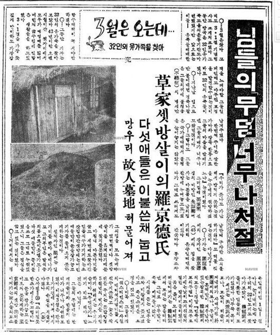 그동안 기자는 32인의 유가족을 찾아보았다. 43년이란 오랜 생활이 간 뒷자리에서 모두가 옛 영예를 잃어버린 채 굶주림에 잇닿은 생활들을 하고 있었다.