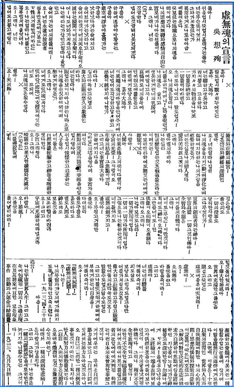 1913년 4월 20일에 쓴 시 「허무혼의 선언」 에 1923년 9월 9일 추언을 덧붙었다.