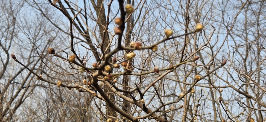 시인 박인환 유택 곁에 피는 생강나무 꽃망울 강원도에서 아주까리 동백꽃이라함 김유정 소설의 동백꽃이다 / 사진 정종배