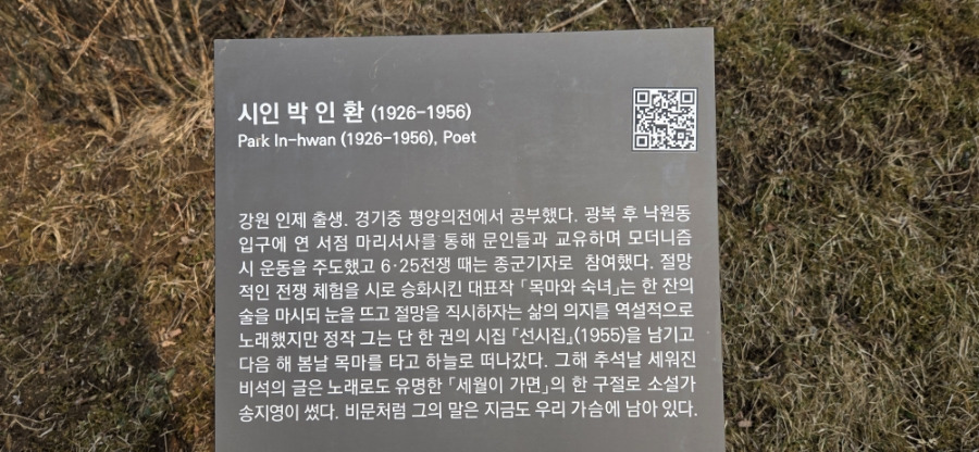 사색의 길에서 시인 박인환 유택으로 내려가는 입구 안내판 / 사진 정종배